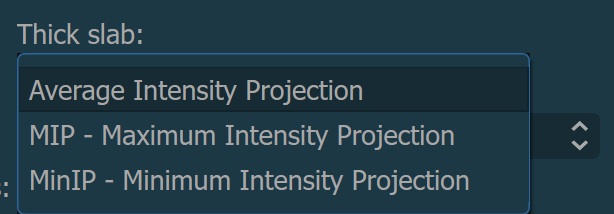 Der aktive Modus für dicke Platten im CT-Viewer kann geändert werden, indem Sie eine Option aus dem Dropdown-Menü Dicke Schicht im unteren Panel des Viewers auswählen.