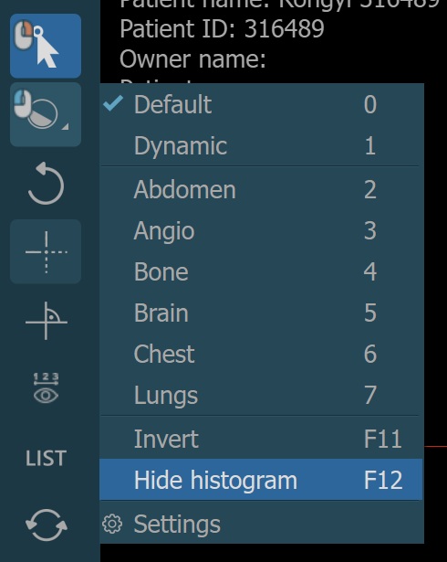 Zusätzlich können Sie eine der verfügbaren Windowing-Voreinstellungen aus dem Dropdown-Menü auswählen, um die entsprechenden Werte für Fensterzentrum und Fensterbreite direkt anzuwenden.
