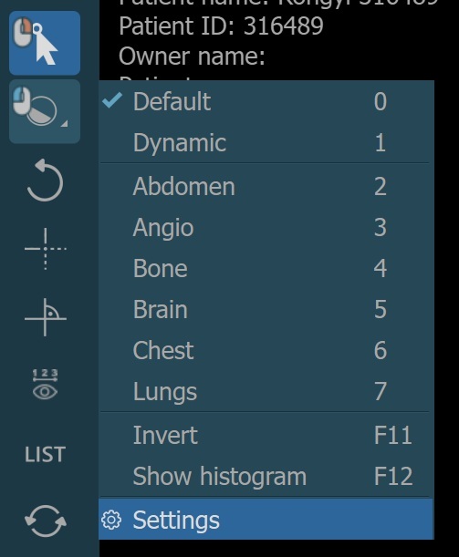 Die Windowing-Voreinstellungen können auch direkt im CT-Viewer geändert werden. Um die Einstellungen der Windowing-Voreinstellungen zu öffnen, wählen Sie die Option Einstellungen im Windowing-Menü.