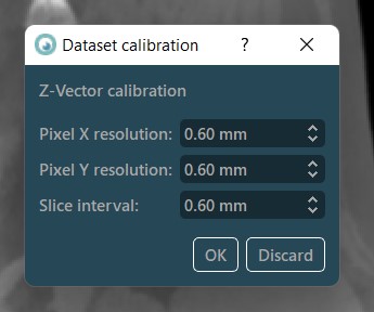 Die Schichten und das gesamte Bild werden in der Szene basierend auf den im DICOM-Header verfügbaren Metadaten ausgerichtet. Die Datensatzkalibrierung bezieht sich auf den Prozess der manuellen Anpassung der erforderlichen Parameter, um die Schichten korrekt zu erzeugen.