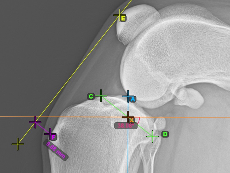 Vervollständigen Sie den TPA-Winkel, indem Sie den hintersten Punkt des Tibiakopfes (Tibiaplateau) markieren. Der TPA-Winkel wird automatisch als der Winkel zwischen der Linie, die die beiden Punkte am Tibiaplateau verbindet, und der senkrechten Linie zur Längsachse der Tibia berechnet.