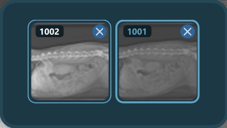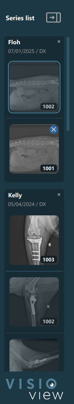 Um komplette Studien aus dem VisioVIEW Viewer zu entfernen, erweitern Sie das Serienpanel und drücken Sie das x-Symbol oben rechts in jeder Studiengruppe. Alle zu dieser Studie gehörenden Bilder werden aus dem Serienpanel entfernt. Entfernen Sie einzelne Serien aus dem Panel, indem Sie das x-Symbol oben rechts in jedem Bild verwenden, das angezeigt wird, wenn Sie jeweils über das Bild fahren.