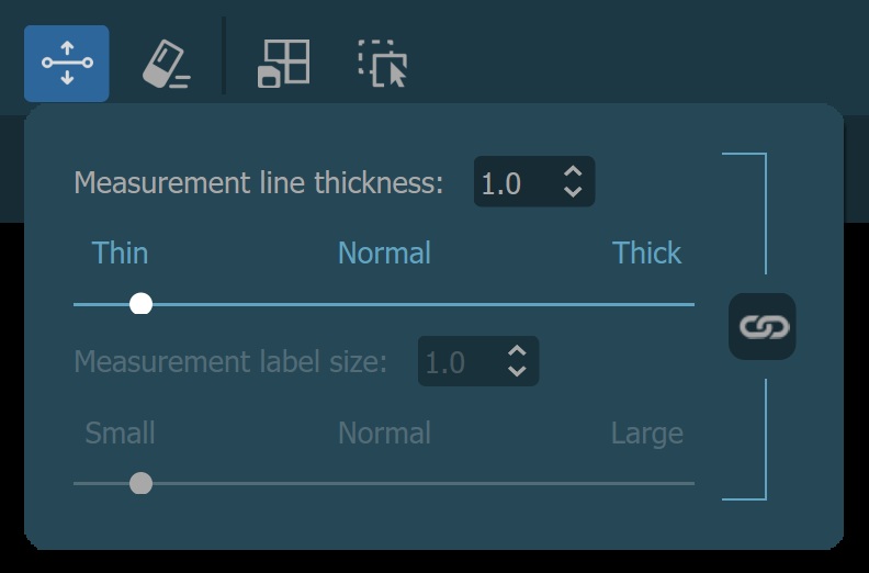 Drücken Sie die Schaltfläche Linienstärke der Messung und Labelgröße in der Viewersymbolleiste, um das entsprechende Panel zu öffnen. Das Aktualisieren der Linienstärke und Labelgröße der Messungen in der aktuellen Ansicht überschreibt die globalen Einstellungen.