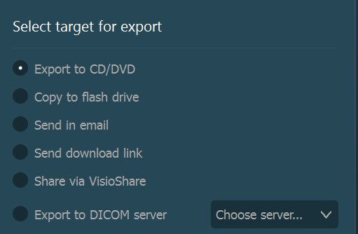 DICOM Start-Software zusammen mit den exportierten Dateien einbeziehen. Wählen Sie, ob die exportierten DICOM-Dateien imVisioVIEW MiniViewerangezeigt oder dieVisioVIEW Gallerymit den exportierten JPG-Bildern im Browser geöffnet werden soll. Diese Option ist nur aktiviert, wenn die DICOM-Dateien zum Export ausgewählt wurden.![]()