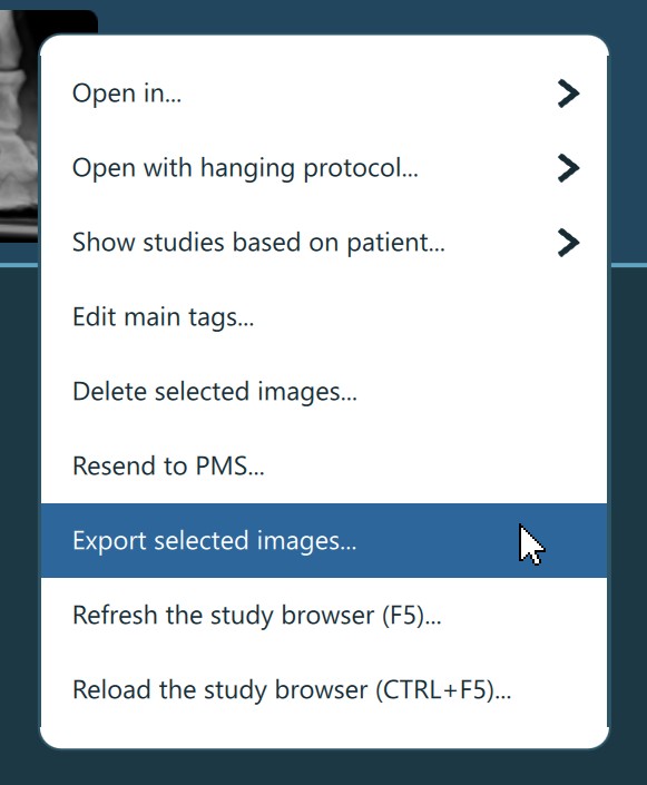 Um ausgewählte Patienten, Untersuchungen und/oder Serien zu exportieren, drücken Sie das Export-Symbol in der Symbolleiste des Studienbrowsers oder wählen Sie die Option Ausgewählte Bilder exportieren.. im Kontextmenü.