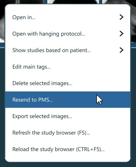 DICOM-Dateien, die aus GDT-Dateien stammen, können aktualisiert und an die DICOM-Arbeitsliste des ausgewählten PACS-Servers gesendet werden. Um die Arbeitsliste mit den neuesten Informationen zu den Studien zu aktualisieren, wählen Sie die Option Erneut an PMS senden... im Kontextmenü.