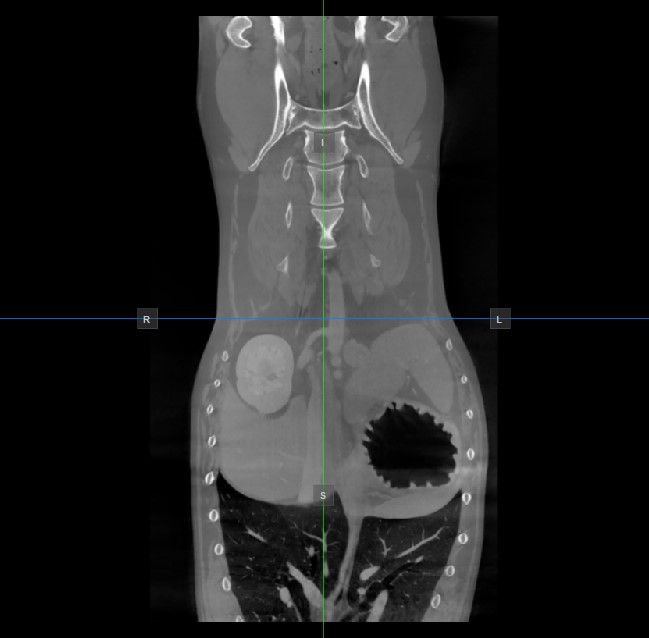The CT Viewer has multiple different overlays over the loaded images, indicating useful information about the study, the image and slicer orientation, as well as the HU pixel values and the cursor position.