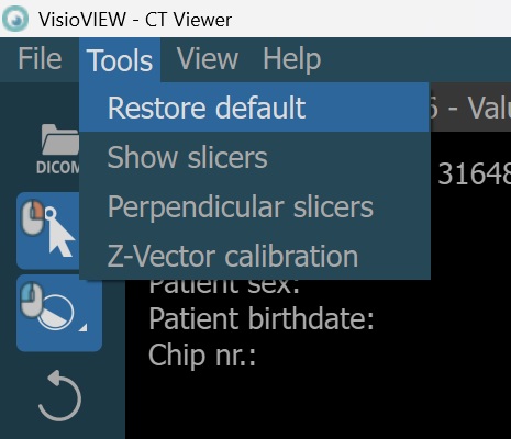 Users can toggle the visibility of the slicers by using the Hide/Show Slicers option from the left toolbar, or using one of the Tools -> Hide Slicers or Tools -> Show Slicers options from the CT Viewer menu.