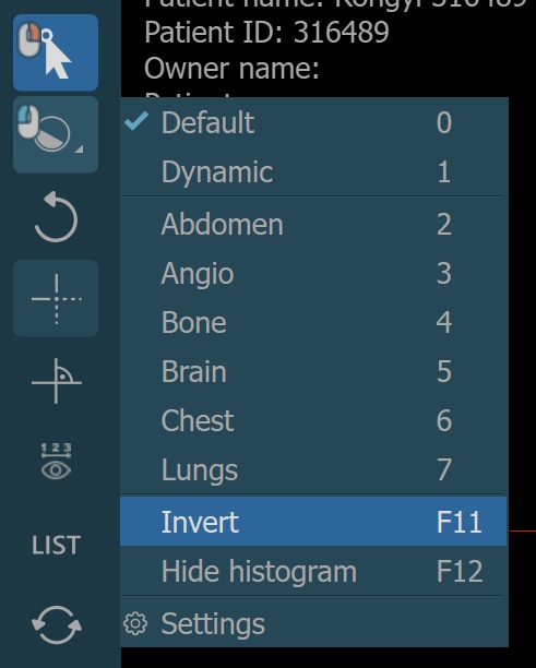 Additionally, choose one of the available windowing presets from the dropdown to directly apply the corresponding window center and window width values.