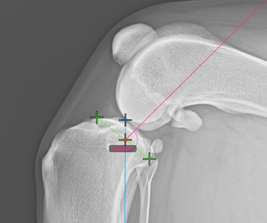 Mark the most caudal point of the tibial head to continue the measurement. Additionally, the software automatically draws a fixed angle measurement of 135°, with the intersection between the long axis of the tibia and the line connecting the most cranial and most caudal point acting as the vertex point for the angle.
