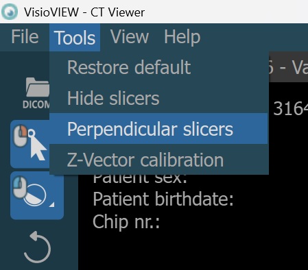 Toggle the Perpendicular Slicers option to switch the active mode of the slicers at any time, or choose one of the Tools -> Perpendicular Slicers or Tools -> Separate Slicers options from the CT Viewer menu.