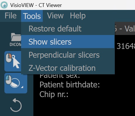 Users can toggle the visibility of the slicers by using the Hide/Show Slicers option from the left toolbar, or using one of the Tools -> Hide Slicers or Tools -> Show Slicers options from the CT Viewer menu.