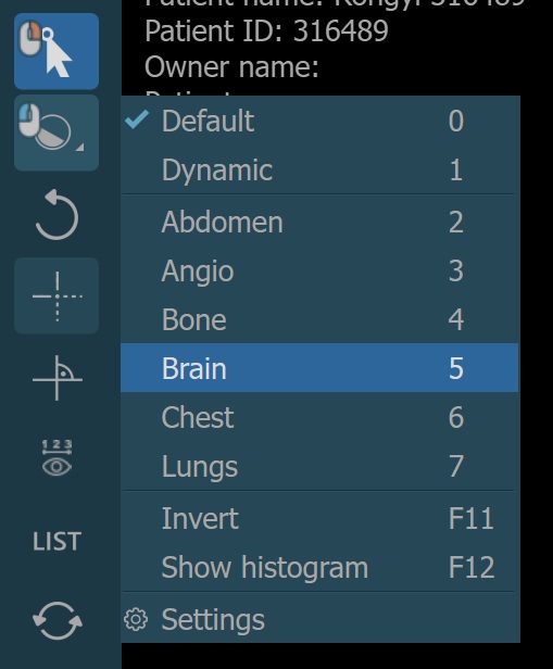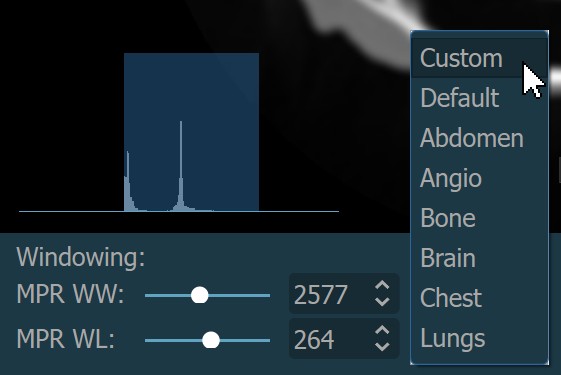 Additionally, choose one of the available windowing presets from the dropdown to directly apply the corresponding window center and window width values.