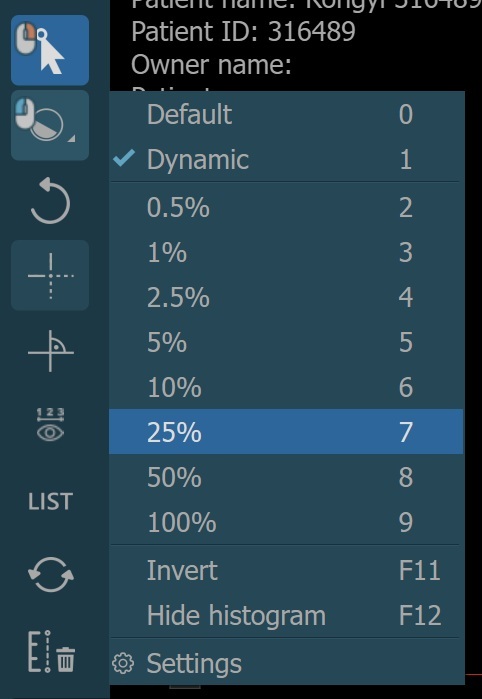 The preset values for the dynamic windowing mode are represented as a percentage of the maximum determined windowing range. All of the preset values are available in the windowing menu when dynamic mode is active.