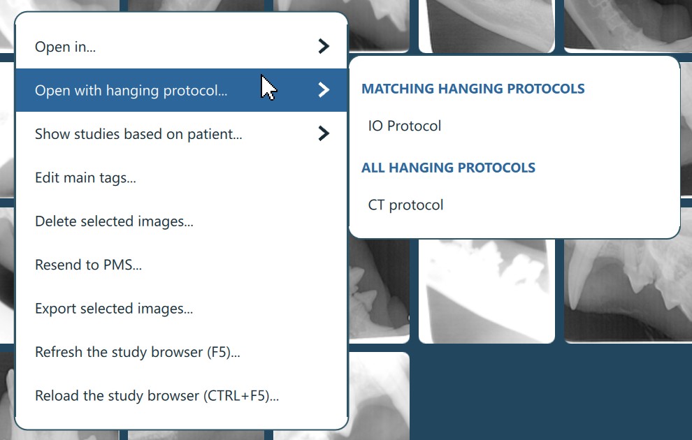 Open the selected images in the VisioVIEW Viewer with a specific Hanging Protocol by selecting the Open with Hanging Protocol -> Hanging Protocol option from the Study Browser context menu. Choose one of the available Hanging Protocols configured in the settings. The Hanging Protocols are sorted based on matching study rules from the selected images.