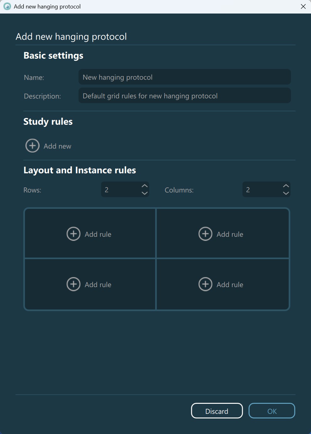 Configure the parameters that define a DICOM Hanging Protocol. To close the dialog and confirm the changes, press OK. Press Discard to cancel any of the modifications and close the dialog.