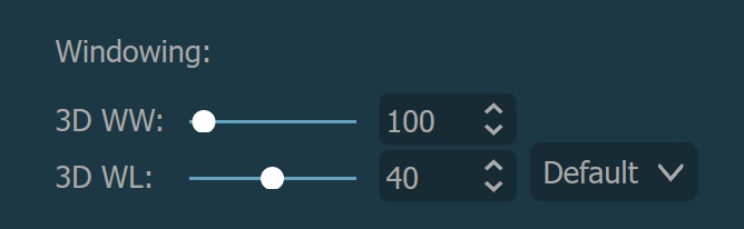 The windowing of the 3D volume is applied in the same way that the windowing for MPR is applied, however they are separated so that they do not interfere with one another. Read more about how to modify the windowing in the following section.