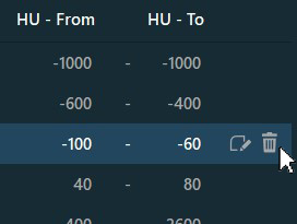 If two HU ranges overlap, the overlapped area becomes invalid and inactive. The invalid ranges are indicated by the mesh pattern on the histogram, red border on the endpoints of the ranges and the red highlighted values in the table.