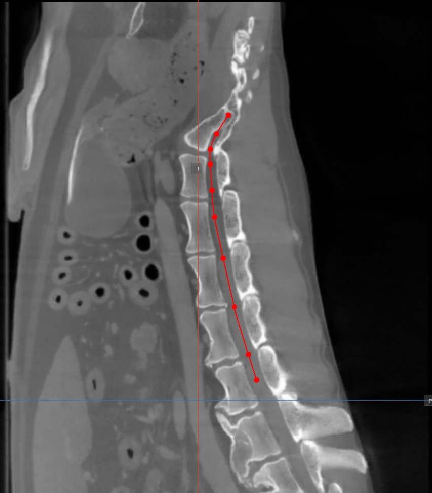 Similar to the regular MPR view, the measurement tools available in the CT Viewer can also be used on the three available CMPR slicer viewports.
