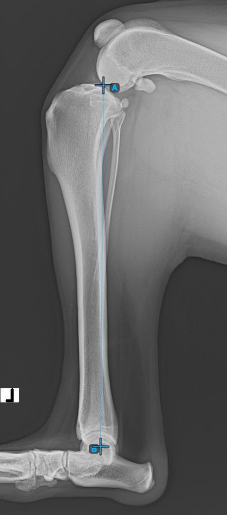 The image below depicts the usual placement of the most cranial point on the tibial plateau.