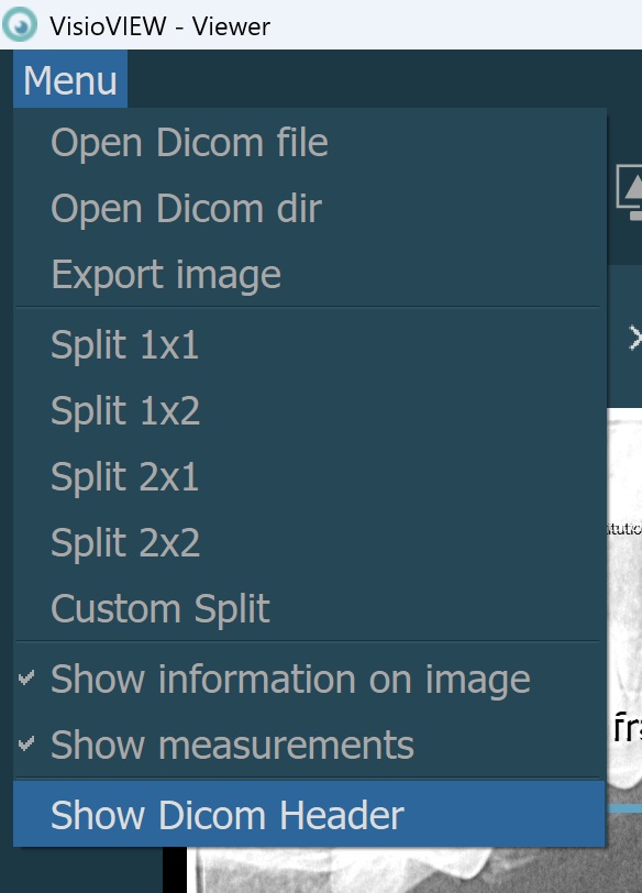 To open the DICOM header window, containing all the metadata information stored in the currently active DICOM file loaded in the Viewer, use the Menu -> Show DICOM Header option from the Viewer menu.