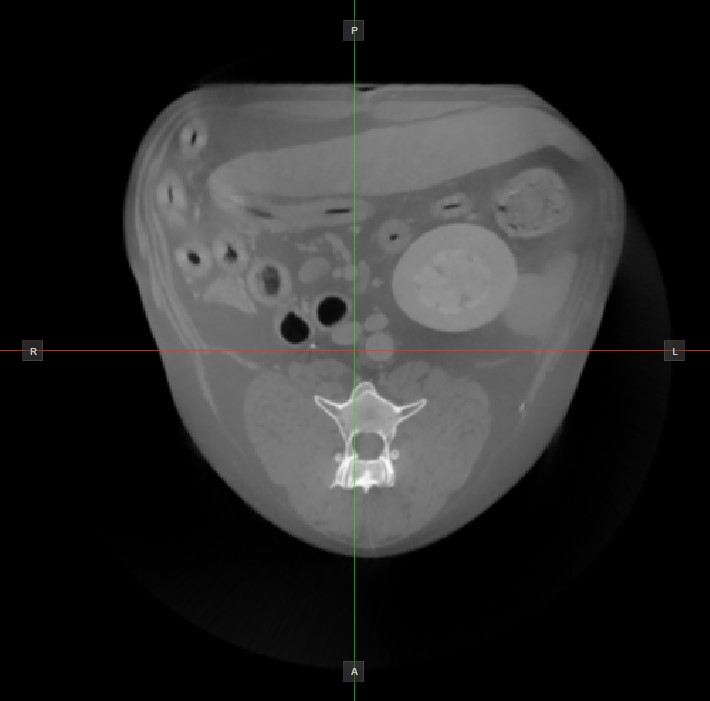 The CT Viewer has multiple different overlays over the loaded images, indicating useful information about the study, the image and slicer orientation, as well as the HU pixel values and the cursor position.