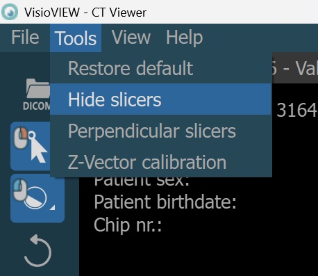 Users can toggle the visibility of the slicers by using the Hide/Show Slicers option from the left toolbar, or using one of the Tools -> Hide Slicers or Tools -> Show Slicers options from the CT Viewer menu.