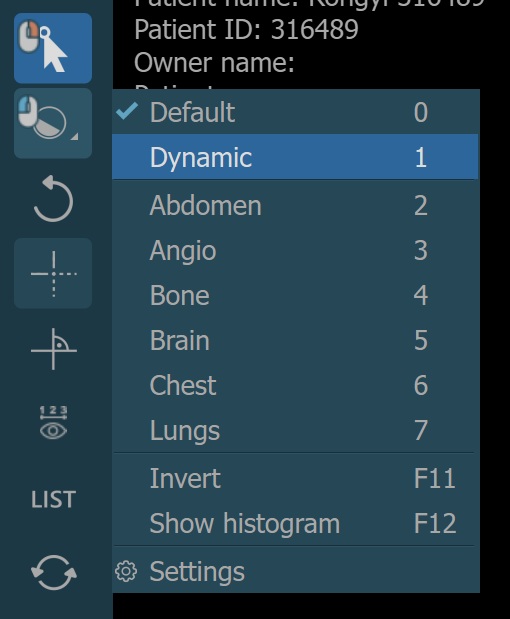 There are two different windowing modes available in the CT Viewer, Default and Dynamic. Change the active windowing mode by using the menu when selecting the Windowing tool.