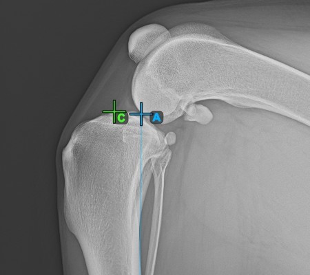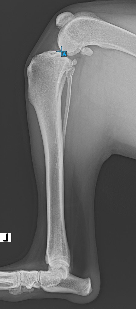The image below depicts the usual placement of the most cranial point on the tibial plateau.