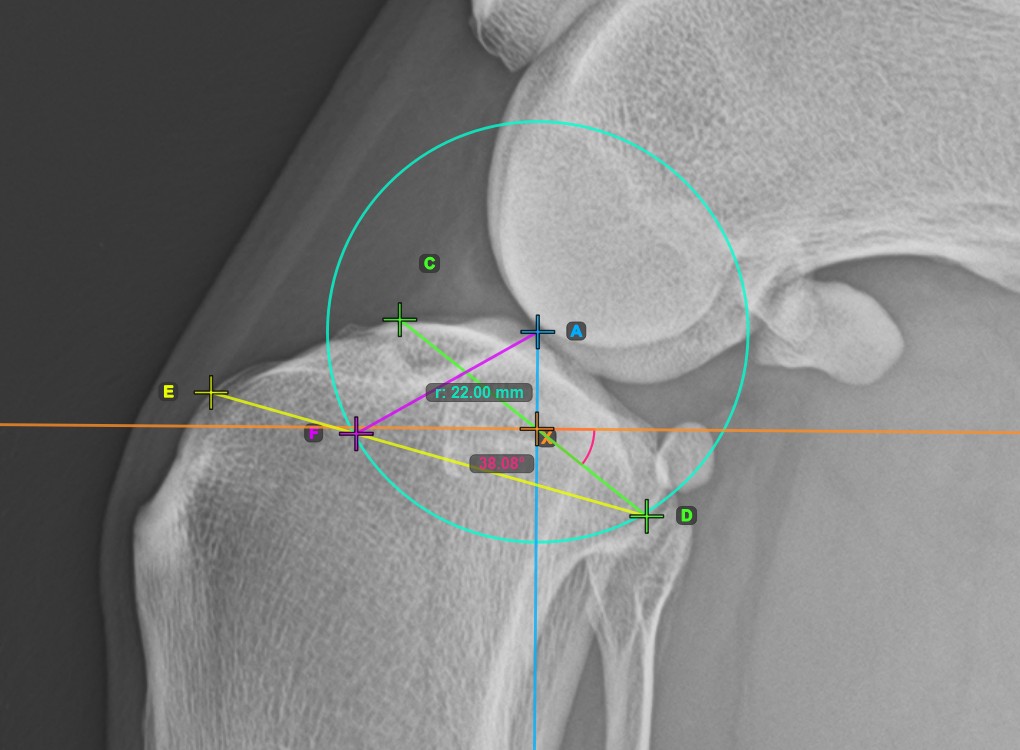The image below depicts the usual placement of the most caudal point on the tibial plateau and the automatically calculated TPA Angle measurement.