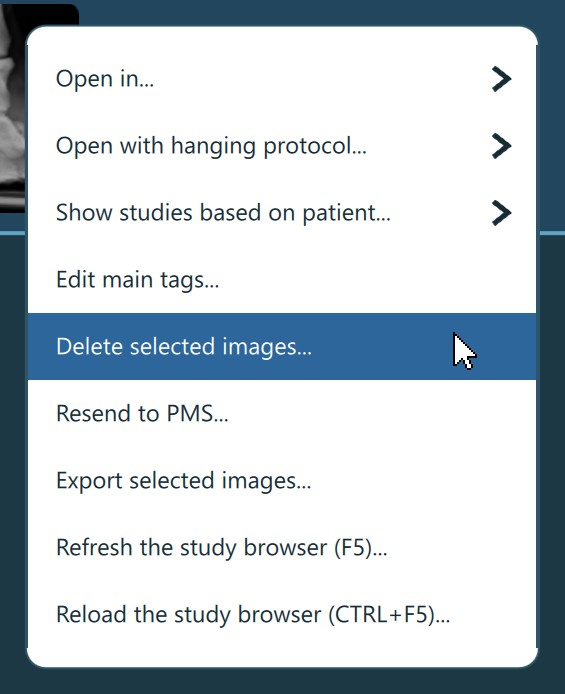 Delete icon in the Study Browser toolbar or select the Delete selected images... from the context menu.To complete the action, confirm the deletion by pressing the Yes button when prompted. Press No to abort the process and return back to the Study Browser. The VisioVIEW opens a new dialog, where users can track the progress of the files