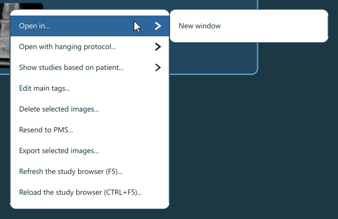 Users can open the selected images in a new instance of the VisioVIEW Viewer by selecting the Open in -> New window option from the Study Browser context menu.