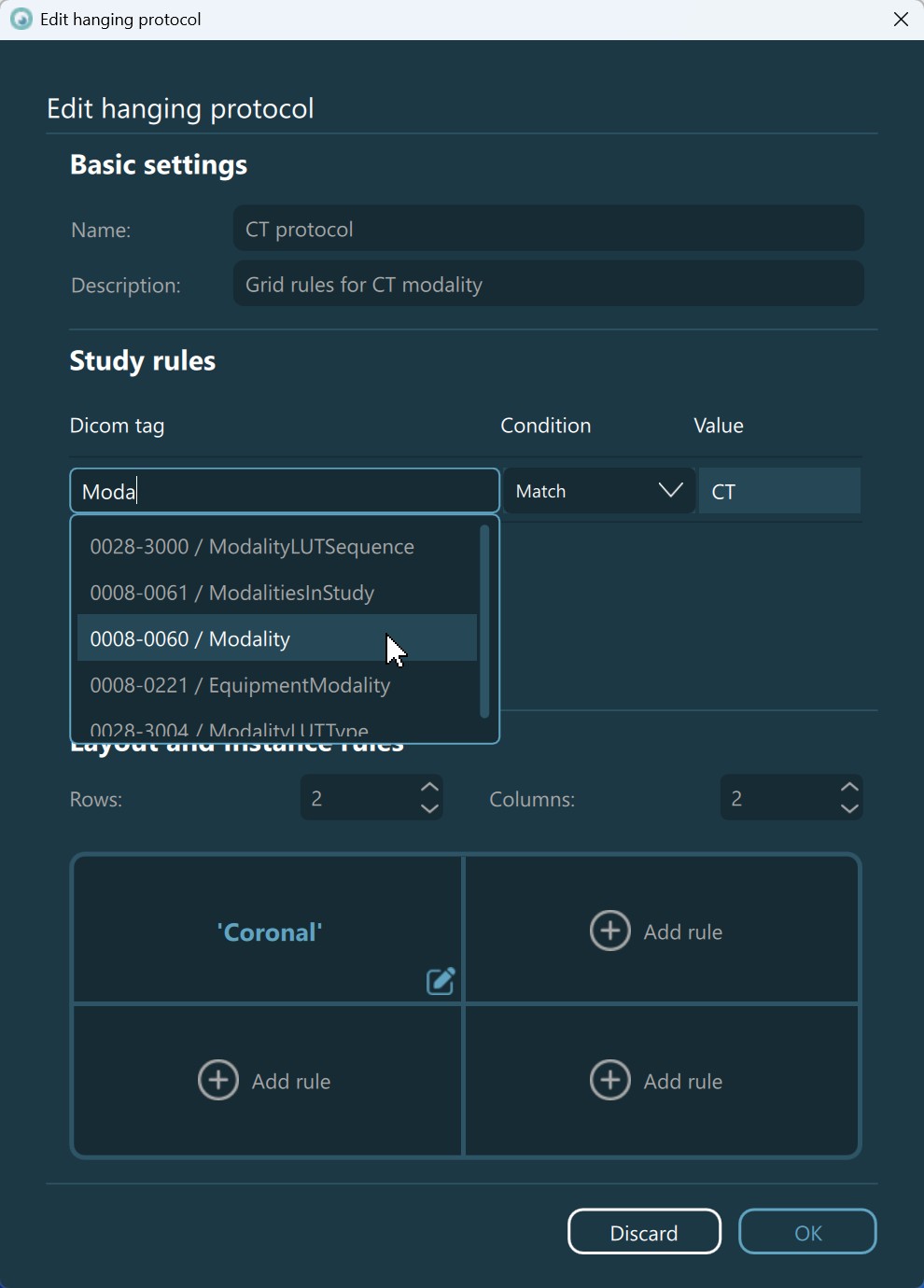 Configure the parameters that define a DICOM Hanging Protocol. To close the dialog and confirm the changes, press OK. Press Discard to cancel any of the modifications and close the dialog.