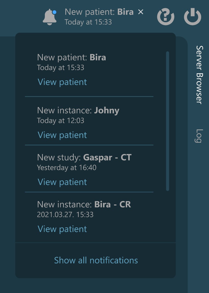 Ha minden helyesen van beállítva, a kiválasztott PACS szerverre érkező új tanulmányok, a Kezdőképernyő Értesítések szekciójában is kijelzésre kerülnek. A kiválasztott értesítéshez kapcsolódó DICOM képeket az értesítések listájában, egy bejegyzés dupla kattintásával, vagy a Enter billentyű megnyomásával nyithatja meg .